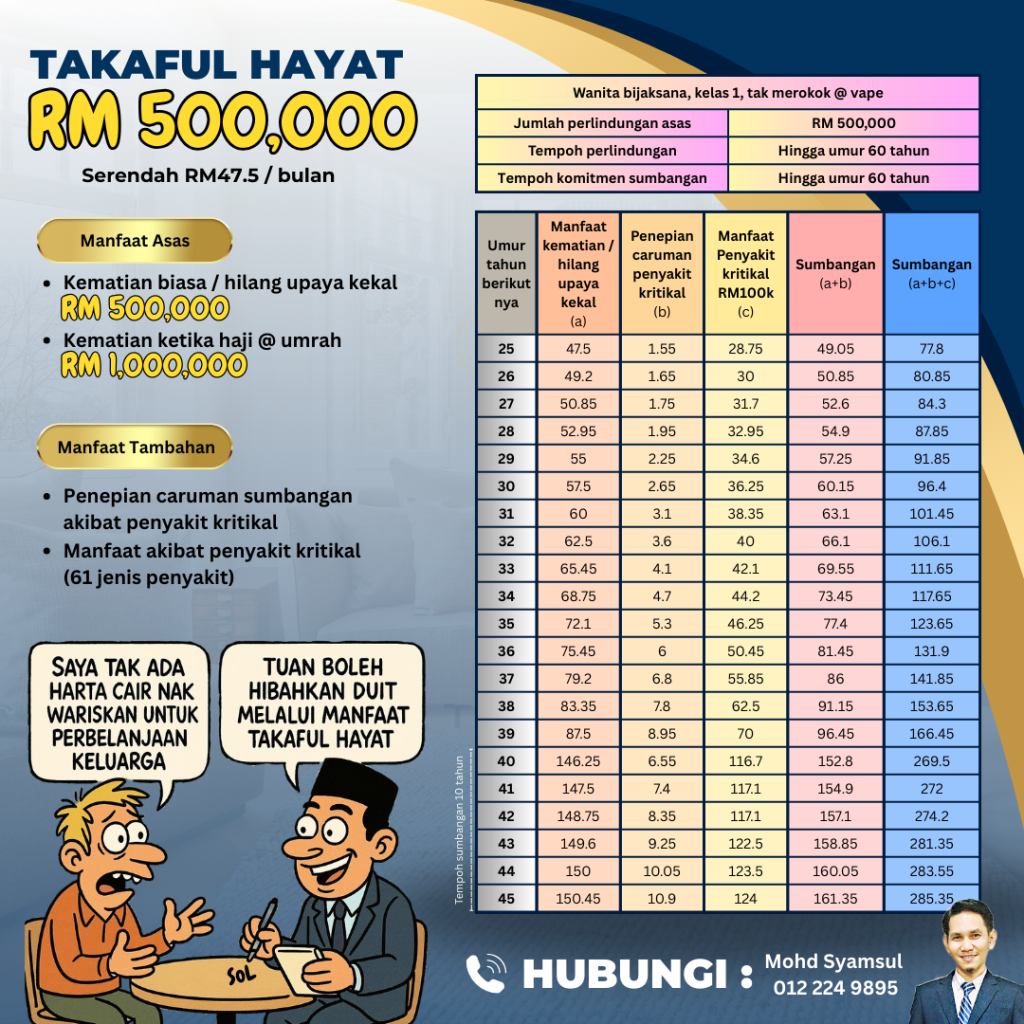 *Bayaran bulanan tetap sampai tamat tempoh – tak meningkat ikut umur (boleh rujuk jadual dalam gambar)